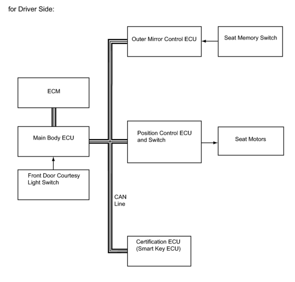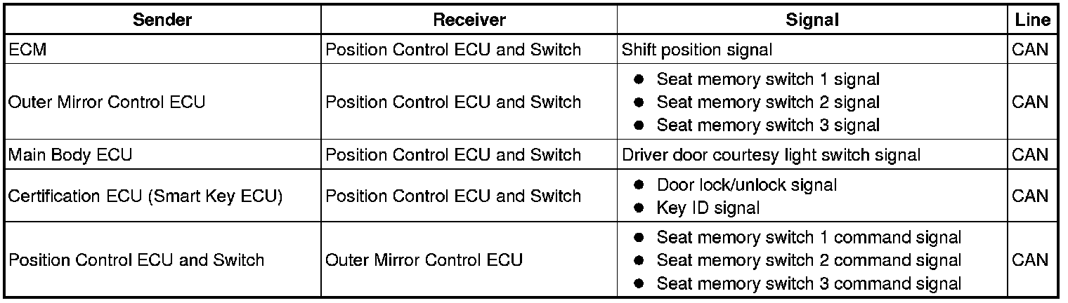 For the driver side memory function, the seat memory switch operation is first transferred from the outer mirror control ECU to the position control ECU and switch via the CAN communication line. Then, either the seat position is stored in memory or a previously stored seat position is recalled.