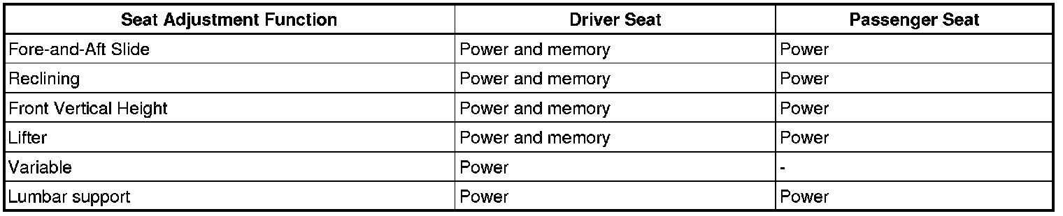 The front power seat functions which can be adjusted with power seat motors and/or memorized are shown in the chart below.