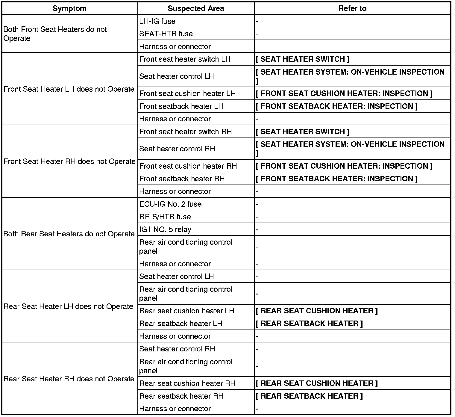 SEAT: SEAT HEATER SYSTEM: PROBLEM SYMPTOMS TABLE