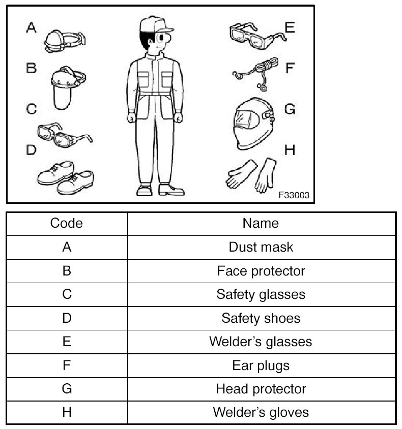 1. In addition to the usual mechanic's wear, cap and safety shoes, the appropriate gloves, head protector, welder's glasses, ear plugs, face protector, dust mask, etc. should be worn as the situation demands.