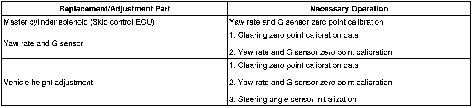 After replacing the master cylinder solenoid and/or yaw rate and G sensor or performing a vehicle height adjustment, make sure to perform yaw rate and G sensor zero point calibration.