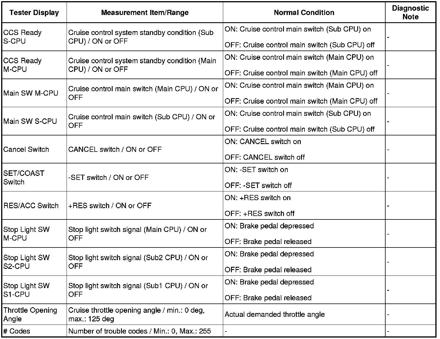 In the table below, the values listed under "Normal Condition" are reference values. Do not depend solely on these reference values when deciding whether a part is faulty or not.