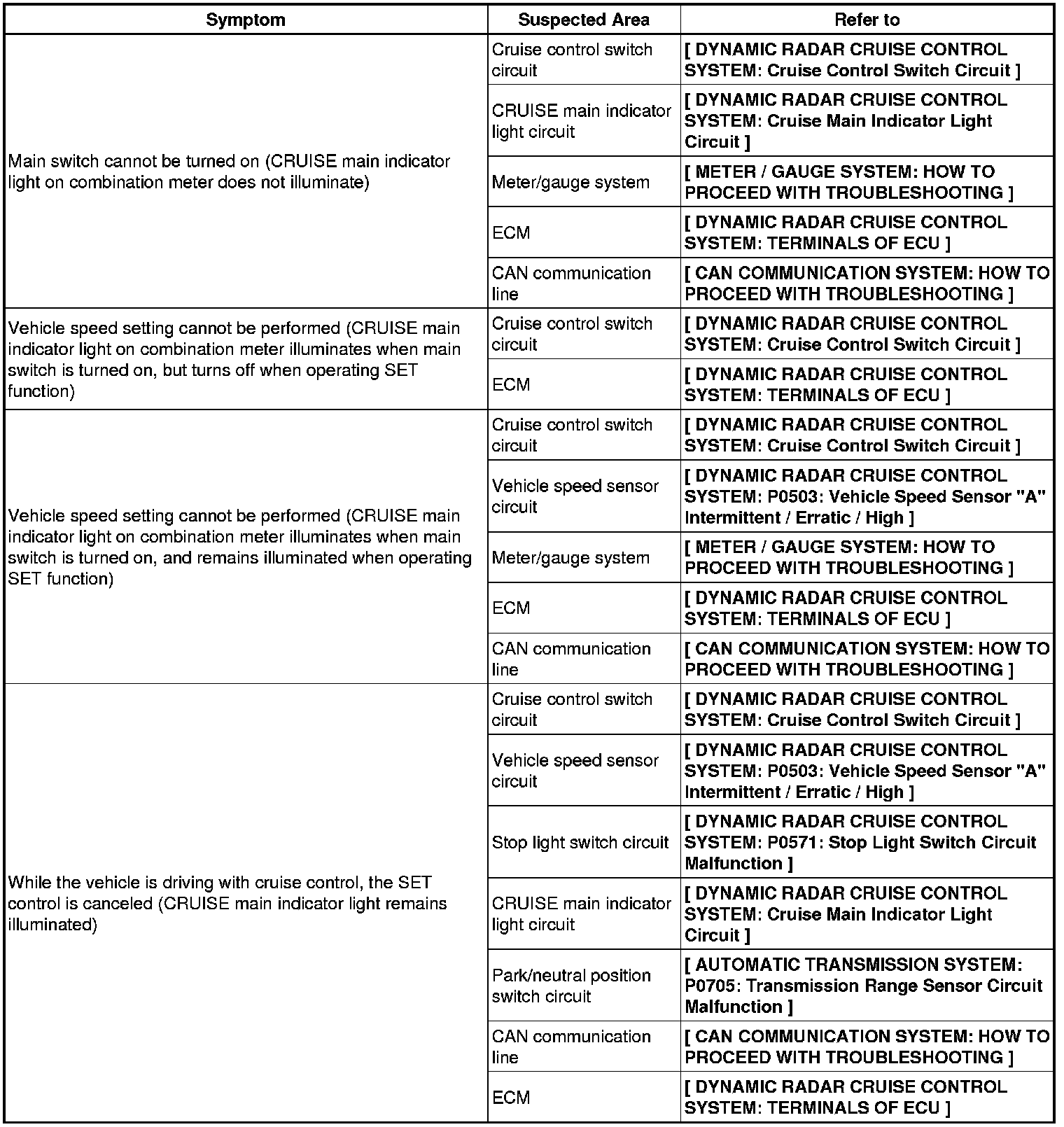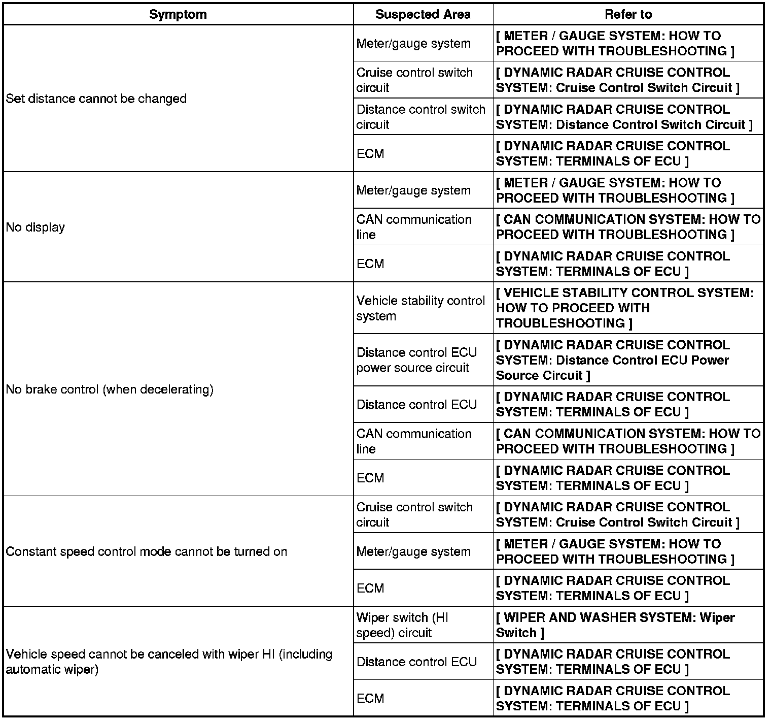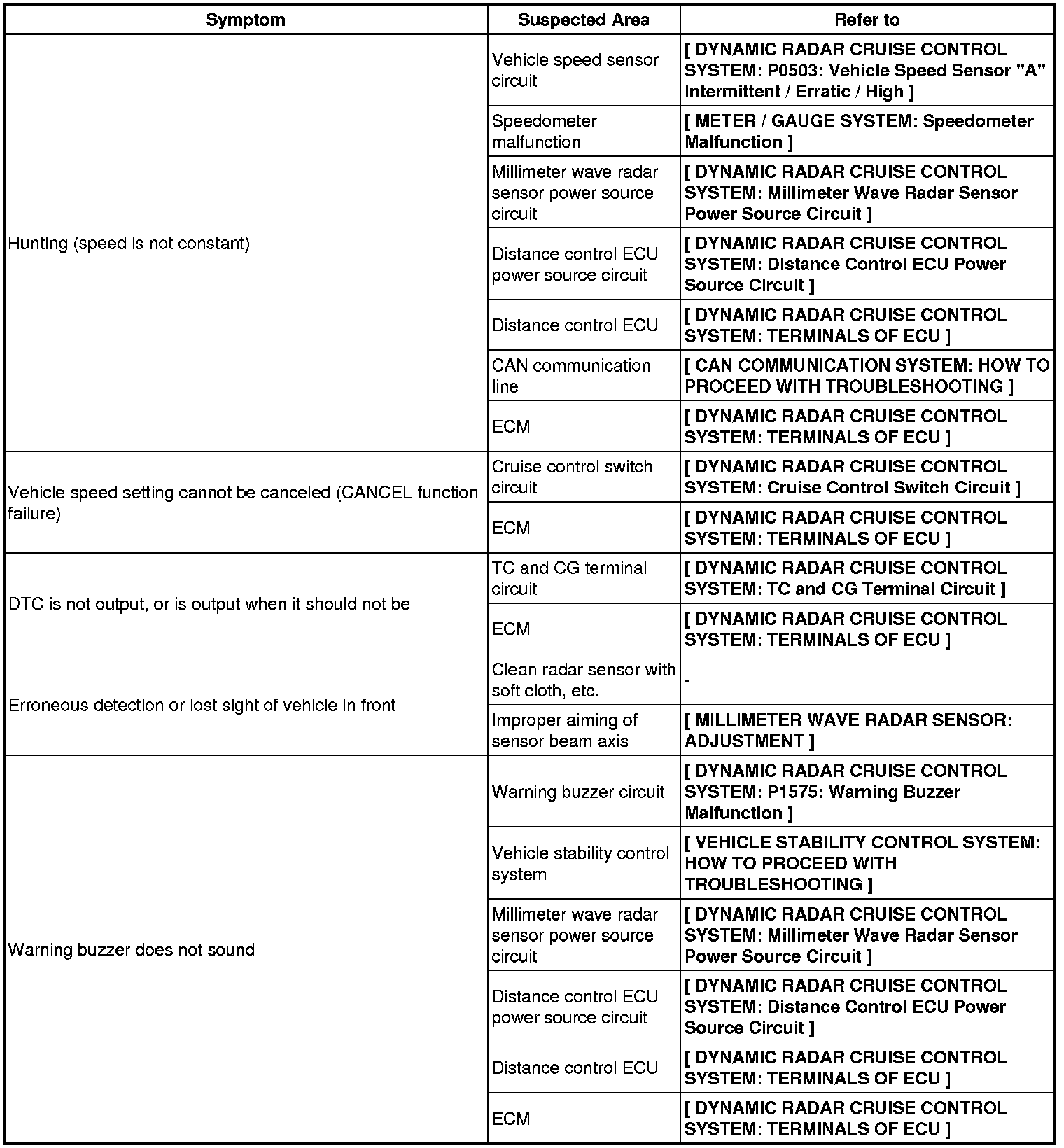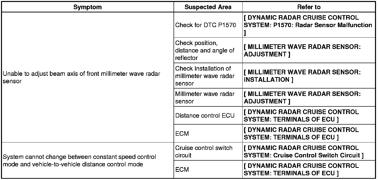CRUISE CONTROL: DYNAMIC RADAR CRUISE CONTROL SYSTEM: PROBLEM SYMPTOMS TABLE