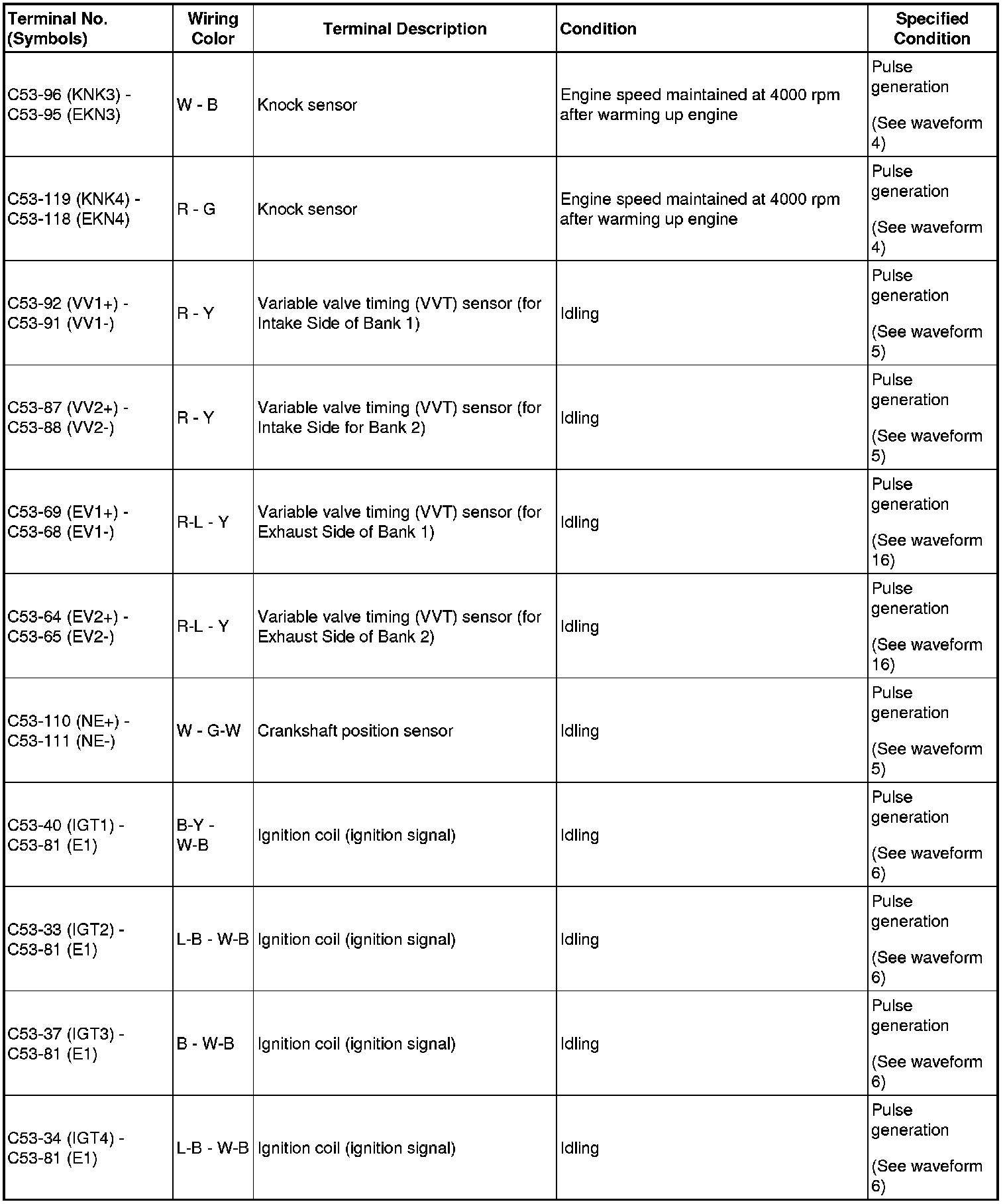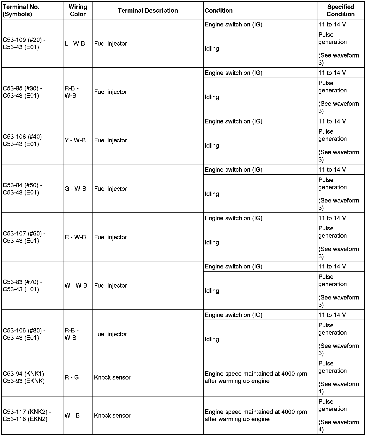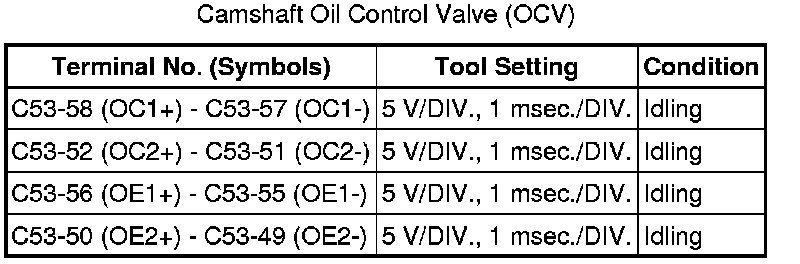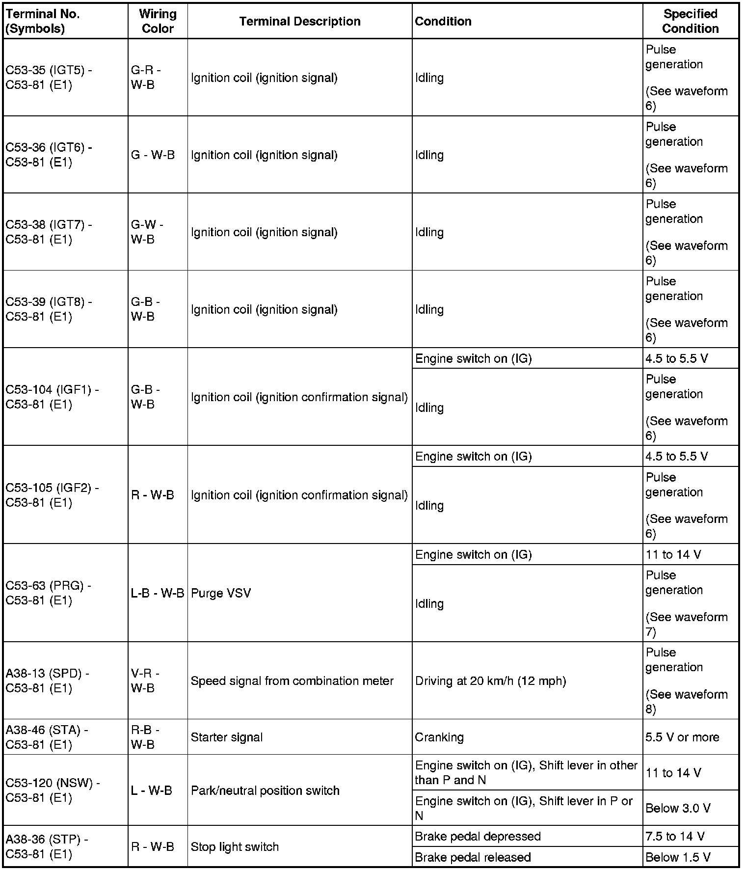 The standard normal voltage between each pair of ECM terminals is shown in the table below. The appropriate conditions for checking each pair of terminals are also indicated. The result of checks should be compared with the standard normal voltage for that pair of terminals, displayed in the Specified Condition column. The illustration above can be used as a reference to identify the ECM terminal locations.