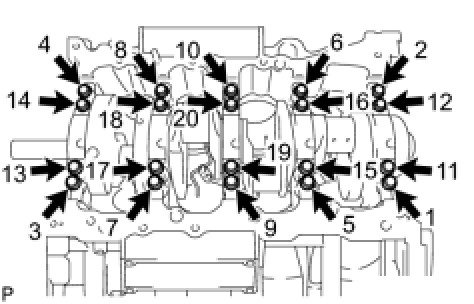 (b) Uniformly loosen and remove the 20 bearing cap bolts in several steps in the sequence shown in the illustration.