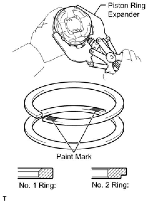 (b) Using a piston ring expander, install the 2 compression rings so that the paint marks are positioned as shown in the illustration.