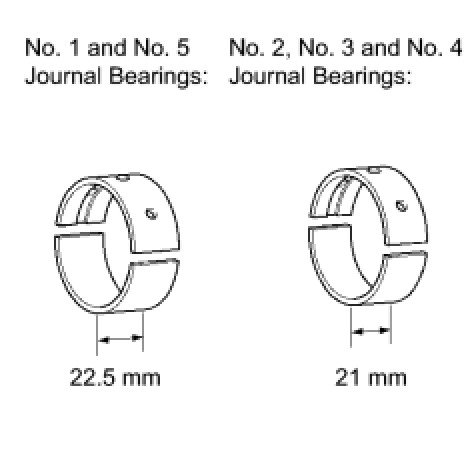 - Main bearings come in widths of 21 mm (0.827 in.) and 22.5 mm (0.886 in.). Install the 22.5 mm (0.886 in.) bearings in the No. 1 and No. 5 cylinder block journal positions with the main bearing caps. Install the 21 mm (0.827 in.) bearings in the No. 2, No. 3 and No. 4 positions.