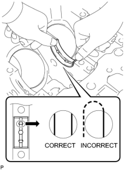 - Both sides of the oil groove in the cylinder block should be visible through the oil feed holes in the bearing. The amount visible on each side of the holes should be equal.