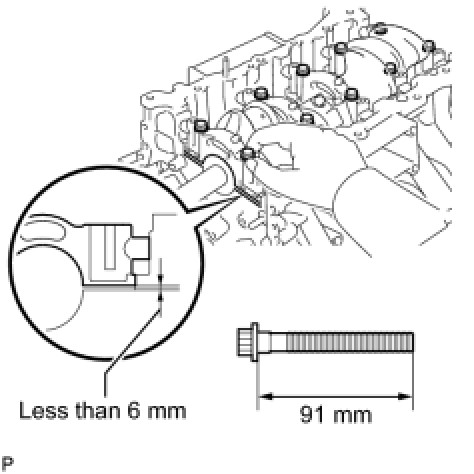 (e) Push the crankshaft bearing cap by hand until the clearance between the crankshaft bearing cap and cylinder block is less than 6 mm (0.236 in.).