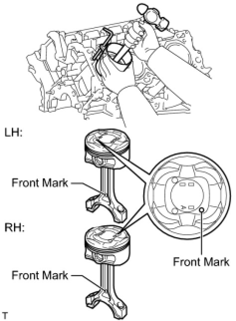 For the LH side, perform the assembly so that the front marks of the piston and connecting rod are on the same side. For the RH side, perform the assembly so that the front marks of the piston and connecting rod are on opposite sides.