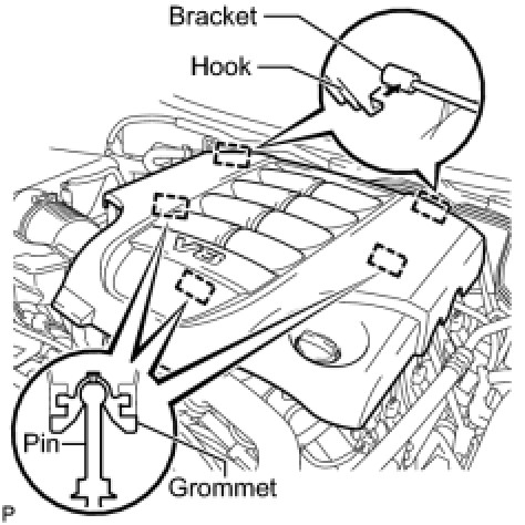 (a) Attach the 2 V-bank cover hooks to the bracket. Then align the 3 V-bank cover grommets with the 3 pins, and press down on the V-bank cover to attach the pins.