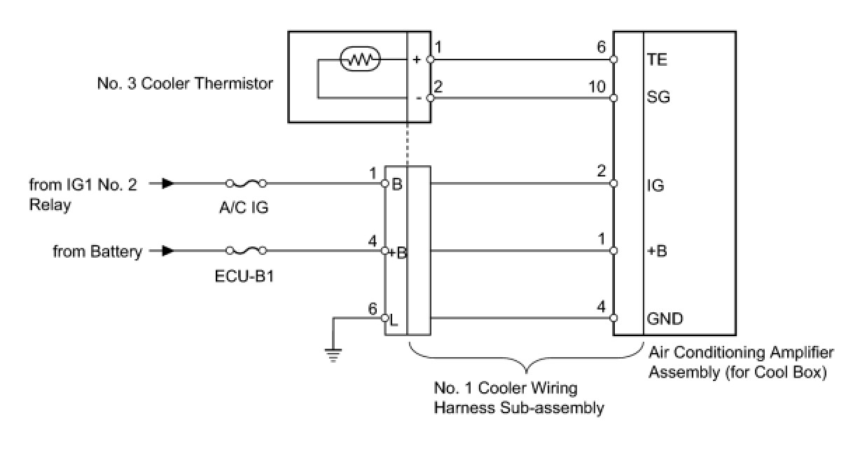 The air conditioning amplifier assembly (for cool box) applies voltage (12 V) to the No. 3 cooler thermistor and reads voltage changes as the resistance of the No. 3 cooler thermistor changes.
