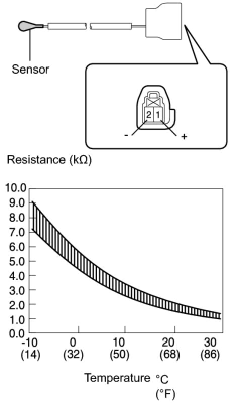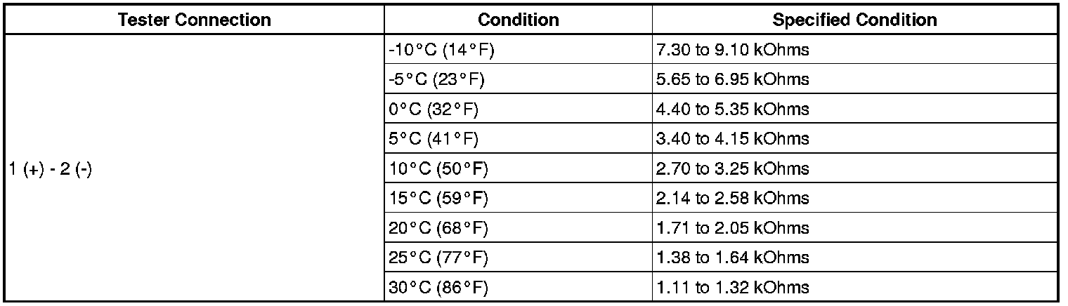 The No. 3 cooler thermistor is installed on the evaporator in the cooling box unit to detect the cooled air temperature that has passed through the evaporator and control the cooling box. It sends appropriate signals to the air conditioning amplifier assembly (for cool box). The resistance of the No. 3 cooler thermistor changes in accordance with the cooled air temperature that has passed through the evaporator. As the temperature decreases, the resistance increases. As the temperature increases, the resistance decreases.