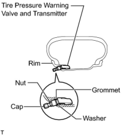 - If the tire and tire pressure warning valve and transmitter have been removed, replace the grommet with a new one.