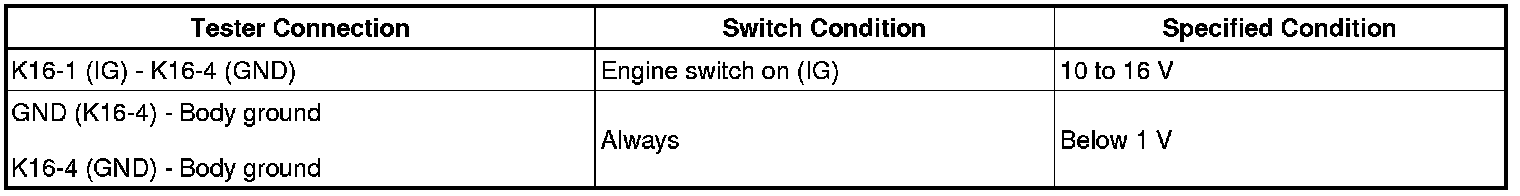 If the result is not as specified, repair or replace the harness or connector.