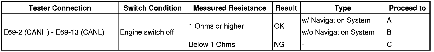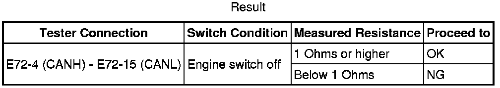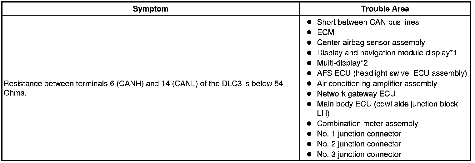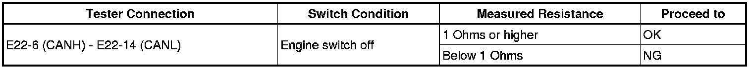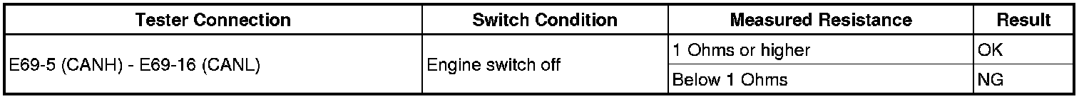 There may be a short circuit between the CAN bus lines when the resistance between terminals 6 (CANH) and 14 (CANL) of the DLC3 is below 54 Ohms.