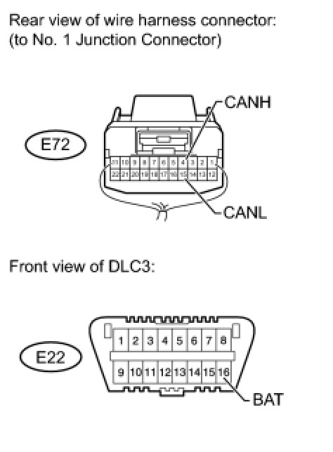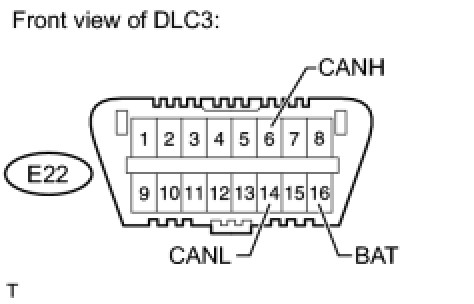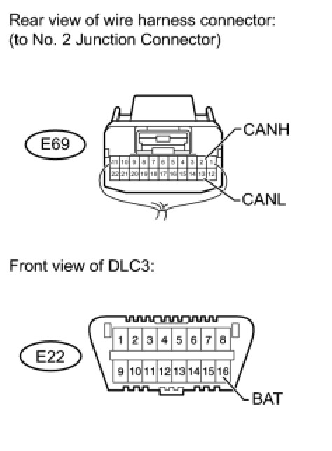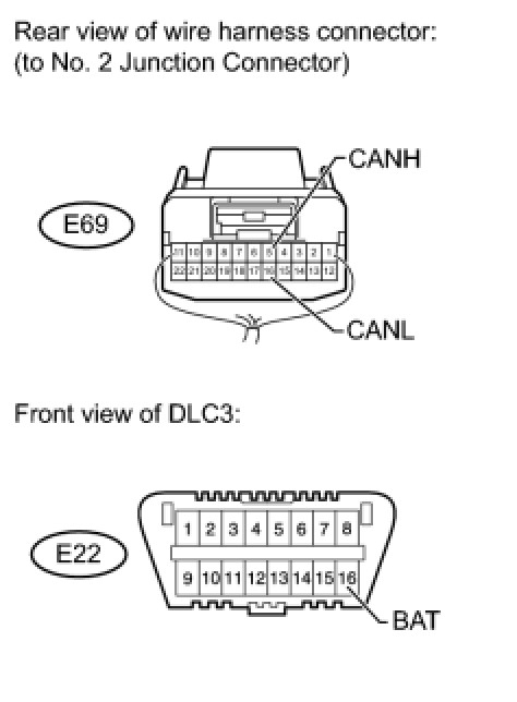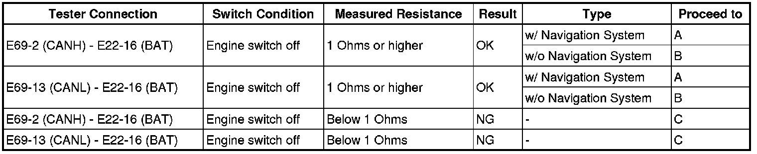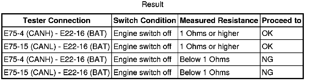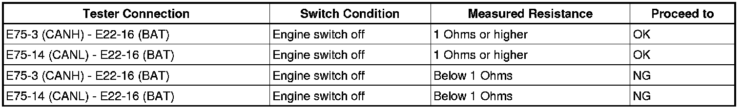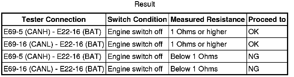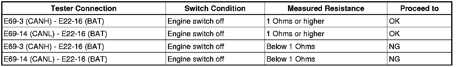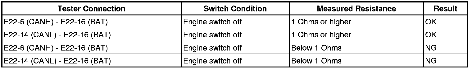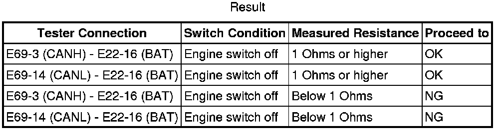 There may be a short circuit between the CAN bus line and +B when there is resistance between terminals 6 (CANH) and 16 (BAT) or terminals 14 (CANL) and 16 (BAT) of the DLC3.
