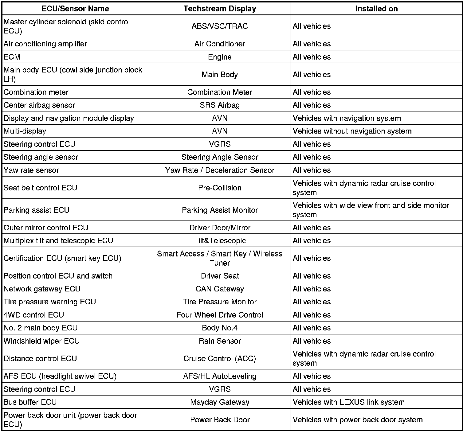 (a) Systems (ECUs and sensors) that use CAN communication vary depending on the optional settings of the vehicle. Check which systems (ECUs and sensors) are installed on the vehicle.
