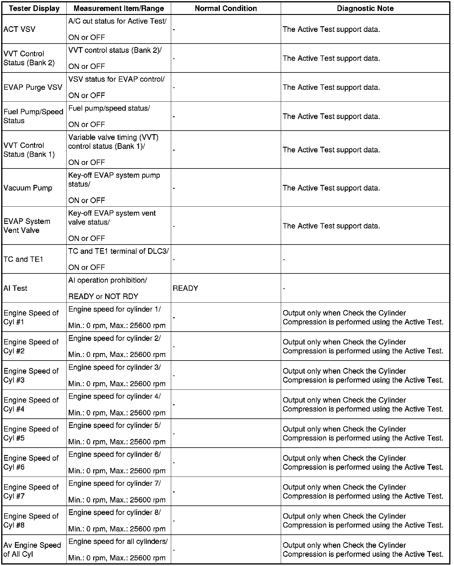 In this Active Test, the fuel and ignition of all cylinders is cut, and cranking occurs for approximately 10 seconds. Then, each cylinder measures the engine speed. If a cylinder engine speed is higher than the other, that cylinder compression pressure is compared to the other, and whether or not the compression pressure is low can be determined.