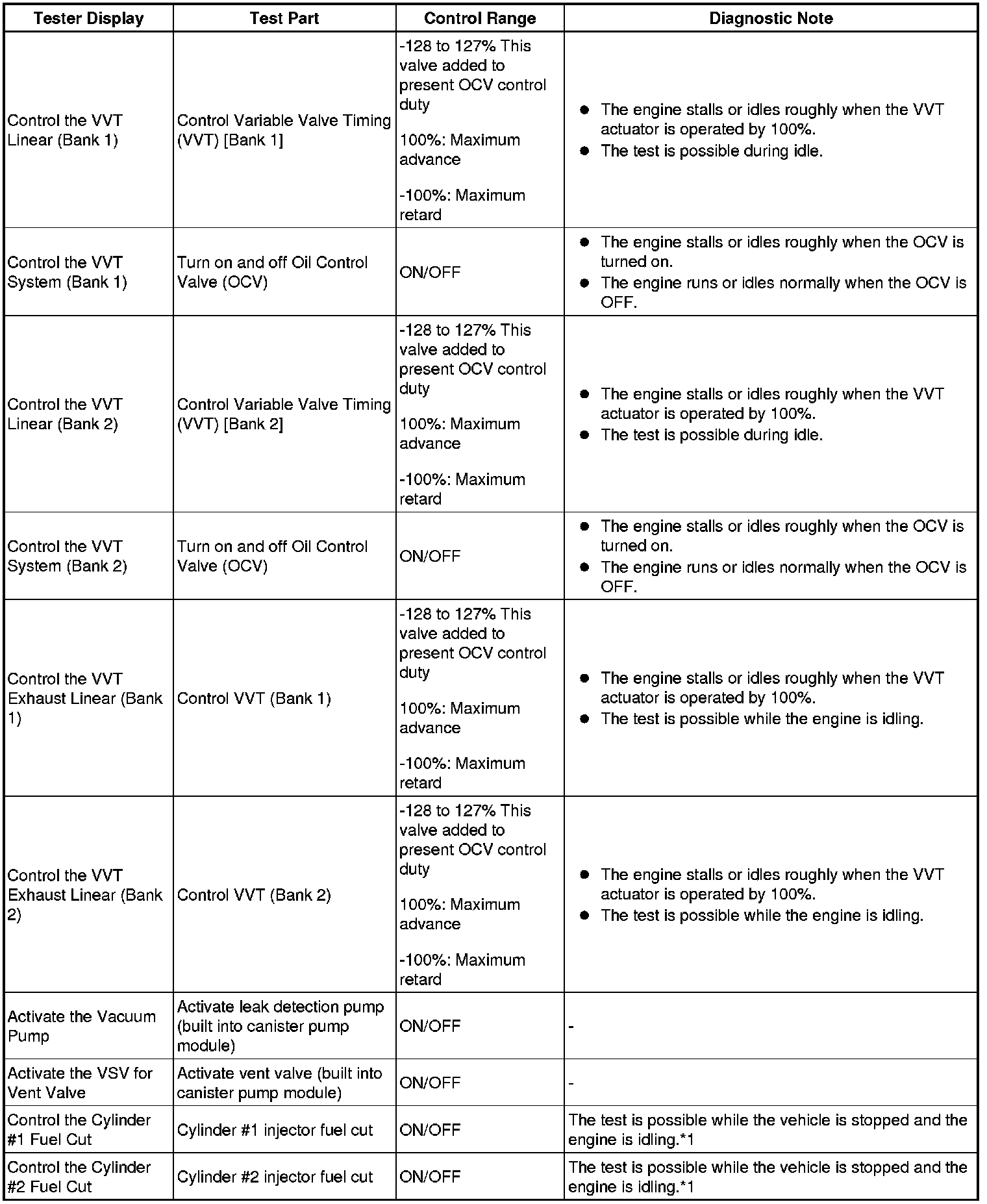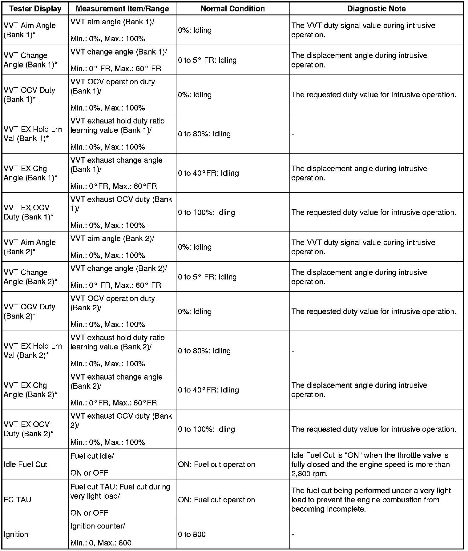 - *: Data List values are only displayed when performing the following Active Tests: Control the VVT Linear (Bank 1), Control the VVT Linear (Bank 2), Control the VVT Exhaust Linear (Bank 1) and Control the VVT Exhaust Linear (Bank 2). For other Active Tests, the Data List value will be 0.