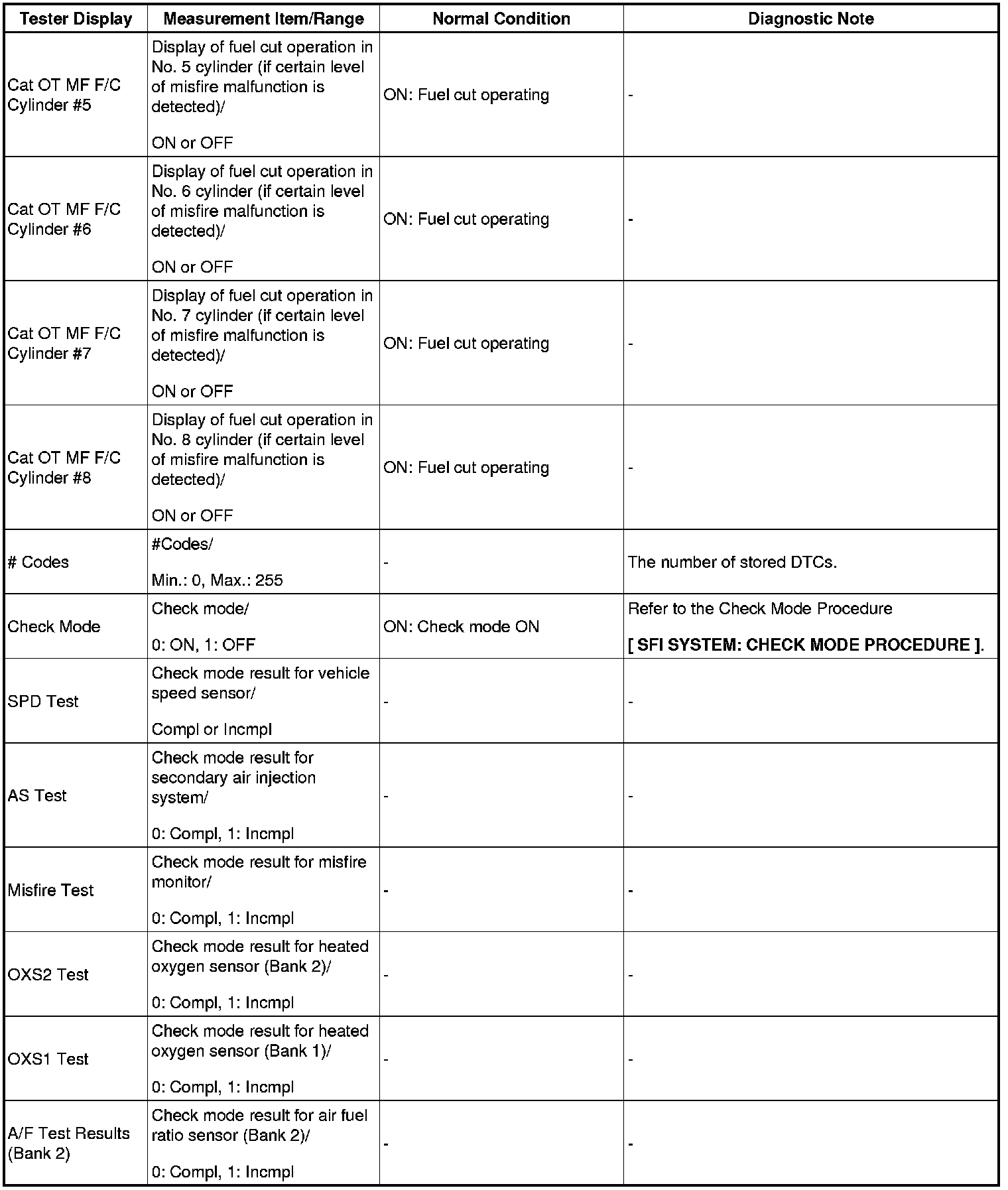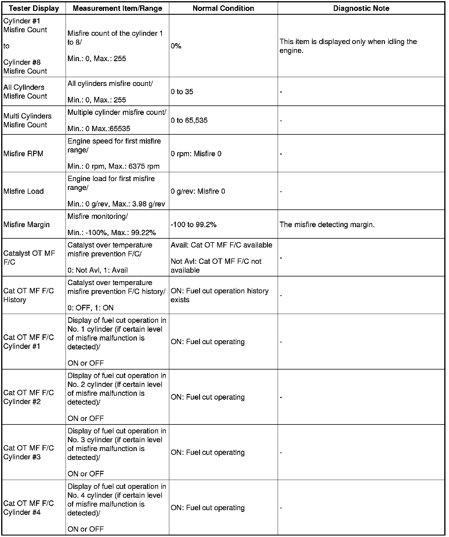 - *1: If the display of the Data List Prohibit the Catalyst OT Misfire prevent F/C item is Avail, perform this Active Test as described below.