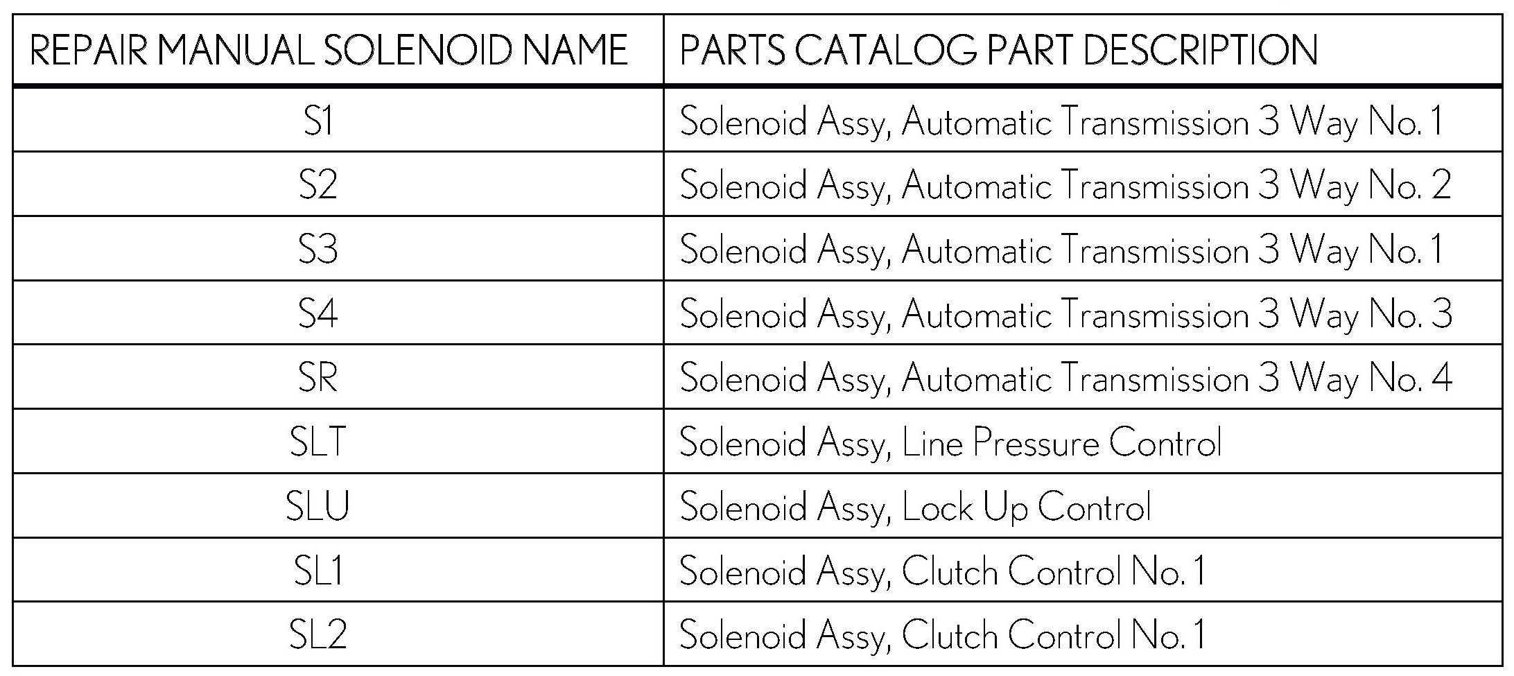 Provided is a chart listing the Repair Manual name of each solenoid used in the AB60F transmission, as well as the part name description provided in the electronic parts catalog.