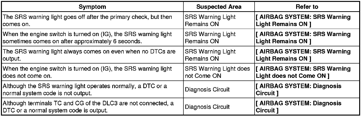 SUPPLEMENTAL RESTRAINT SYSTEMS: AIRBAG SYSTEM: PROBLEM SYMPTOMS TABLE
