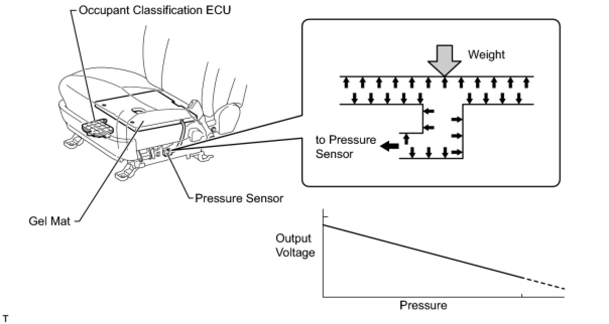When weight is applied to the gel mat, the pressure applied through the silicone to the pressure sensor changes. The pressure sensor converts these changes into voltages and transmits them to the occupant classification ECU.