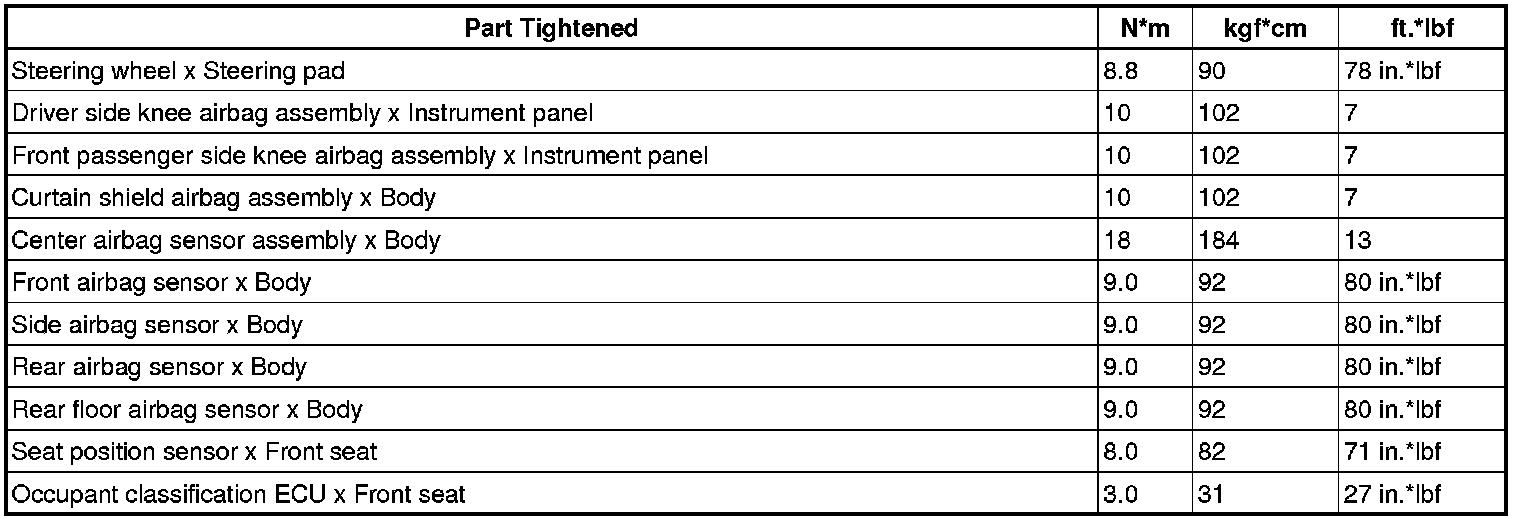 SPECIFICATIONS: SUPPLEMENTAL RESTRAINT SYSTEMS: TORQUE SPECIFICATIONS