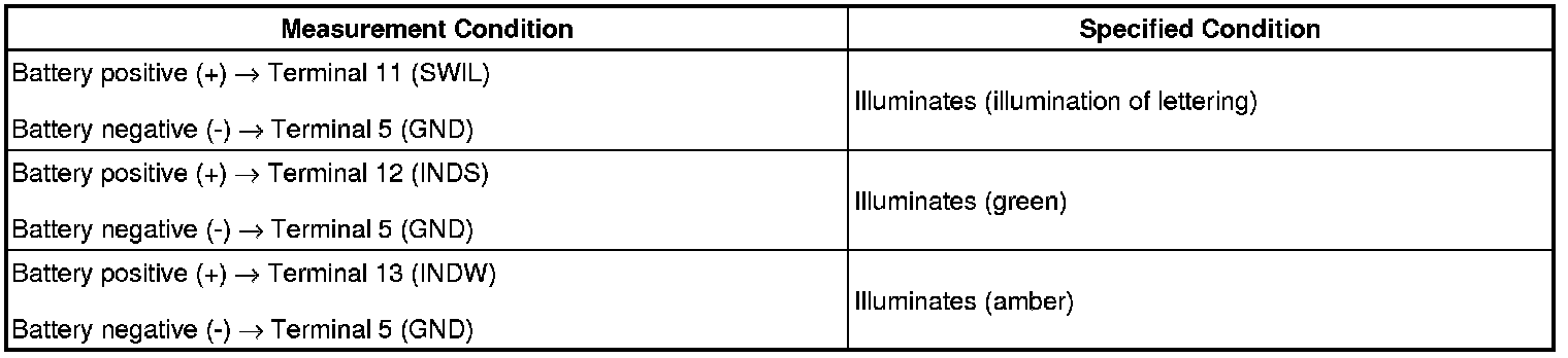 (b) Apply battery voltage between the terminals of the switch, and check the illumination condition of the switch.