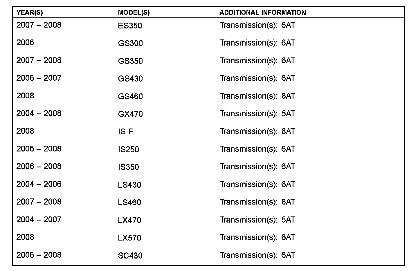 Please see TSIB No. TC008-07, "World Standard Automatic Transmission Fluid", for important tips when working with ATF WS.