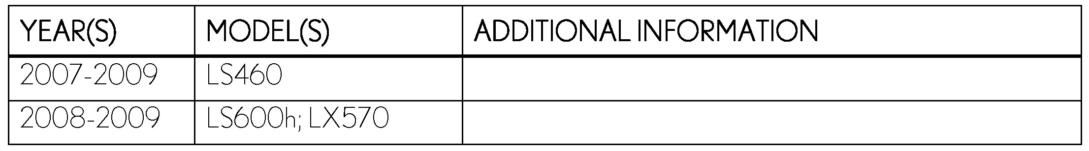 - January 28, 2010: Applicability has been updated to include 2008 - 2009 model year LX 570 and 2009 model year LS 460/600h vehicles.