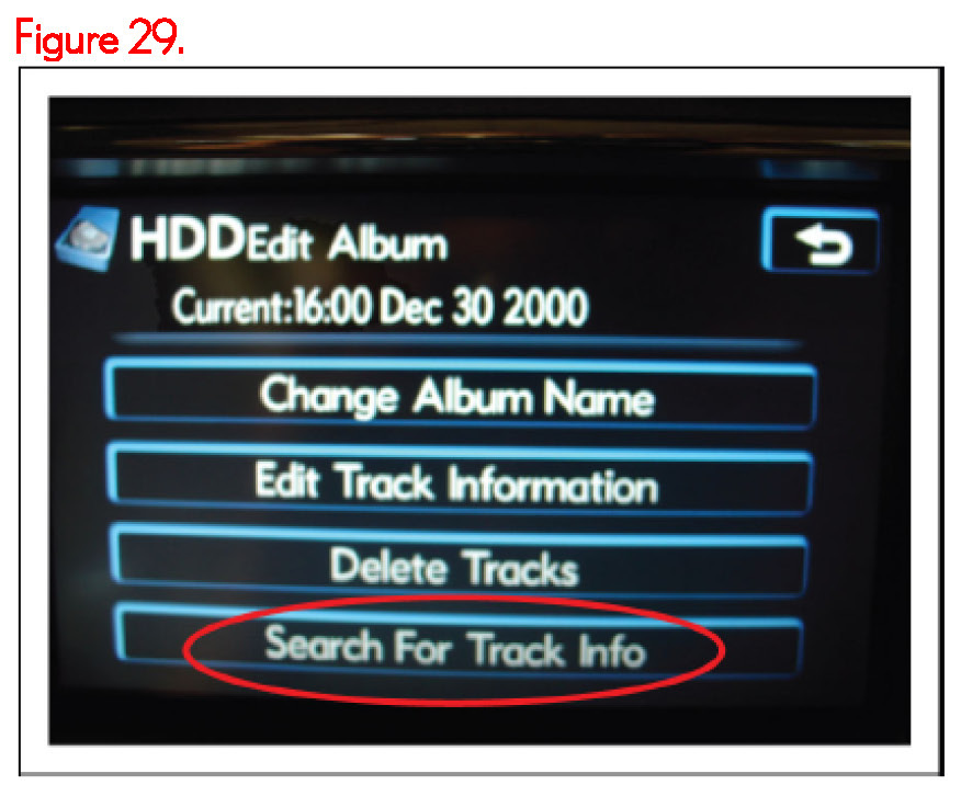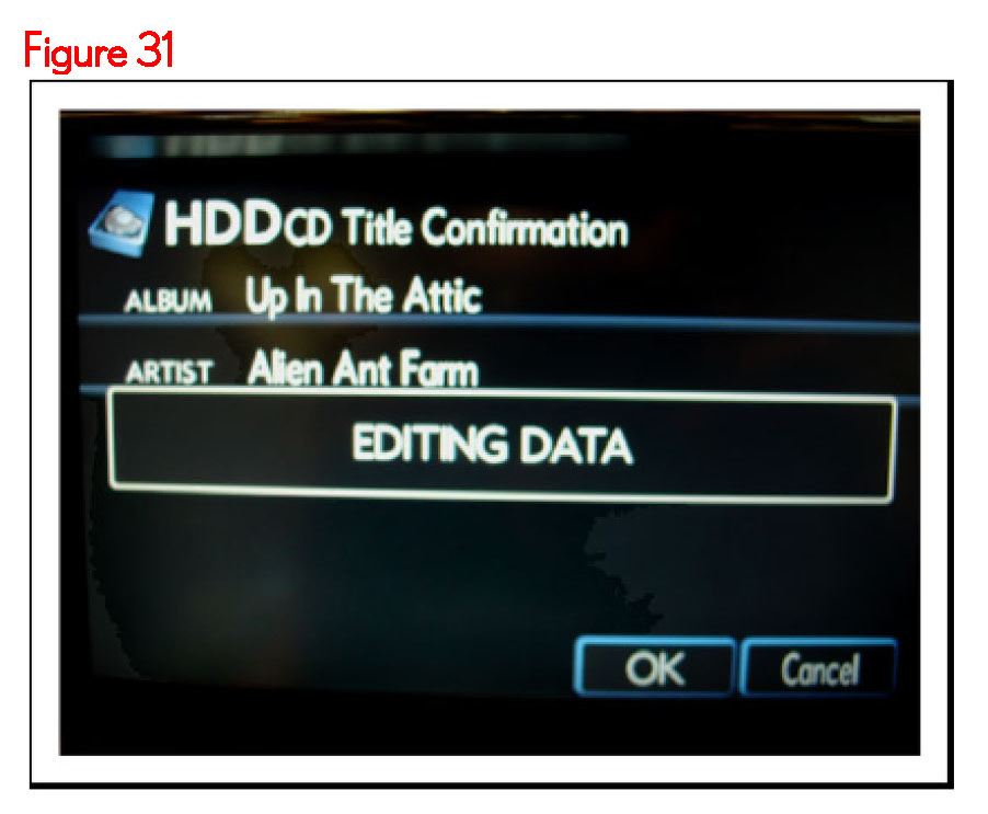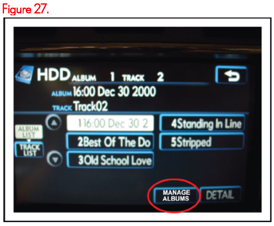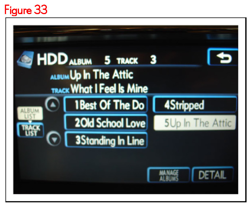 Lexus models equipped with a Hard Disk Drive (HDD) Navigation System contain a jukebox feature that allows up to 2000 audio recordings to be transferred from their original CD media to the HDD on-board the vehicle. Detailed information about the audio recordings is attached to each track at the time of transfer. When each audio track is presented on the touch screen informational details including Genre, Artist, Album, and Title are presented. This detailed track information is stored on the HDD in the Compact Disc Database or CDDB.