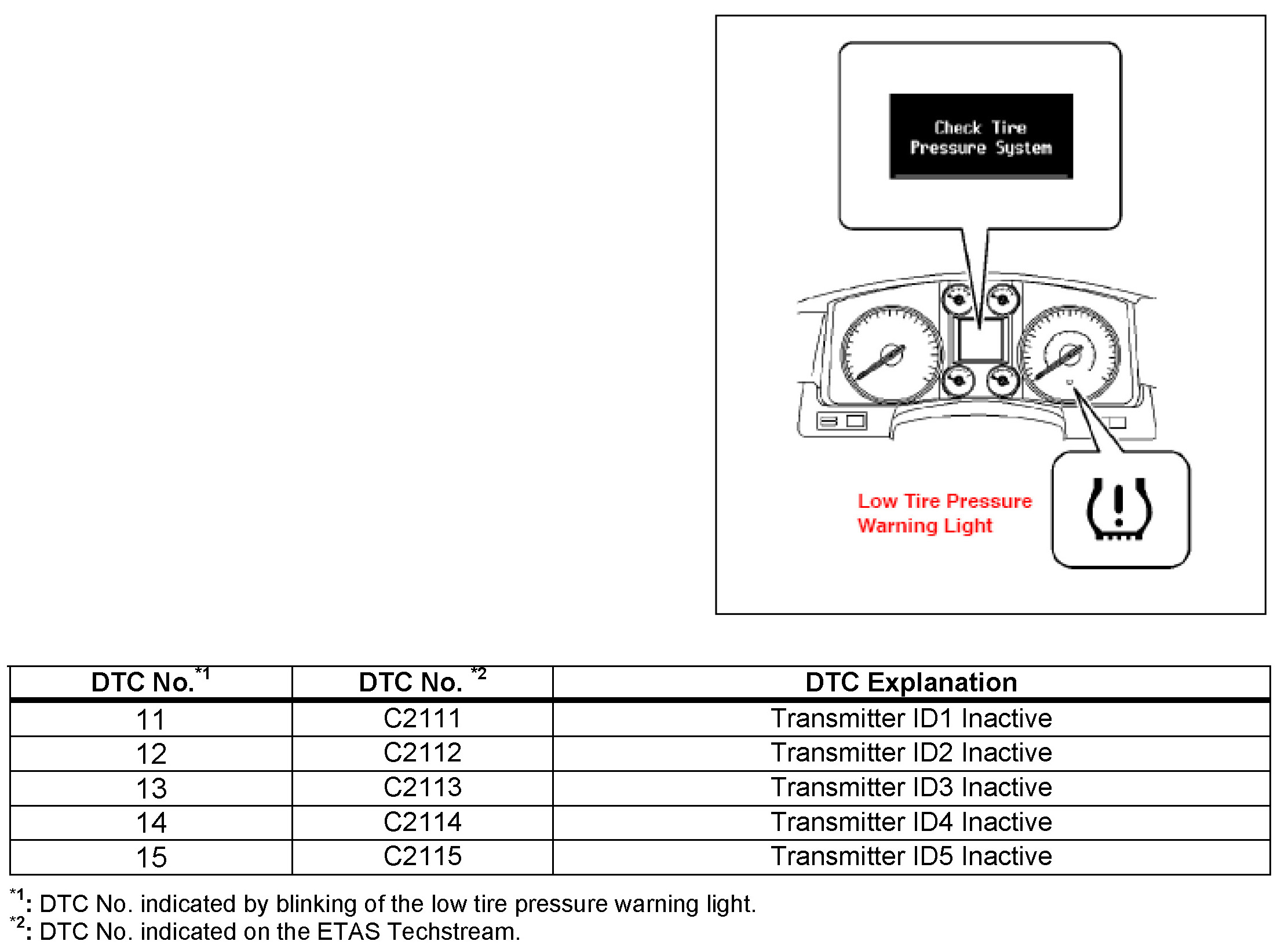 - The Diagnostic Trouble Codes (DTCs) listed may be stored in the TPWS ECU until the tire pressure warning valves/sensors are activated.