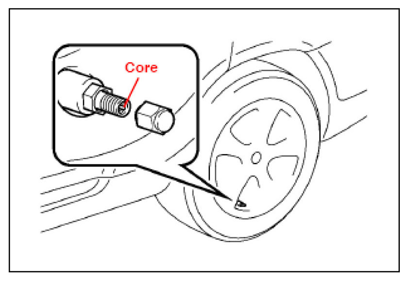 3. Press or remove the valve core to reduce the tire inflation pressure rapidly by 6 psi (0.4 kgf/cm2, 40 kPa), or more, within 30 seconds.