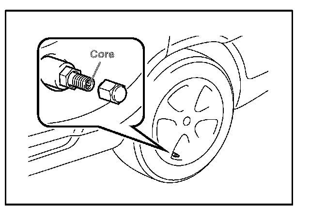 3. Press or remove the valve core to reduce the tire inflation pressure rapidly by 6 psi (0.4 kgf/sq.cm, 40 kPa), or more, within 30 seconds.