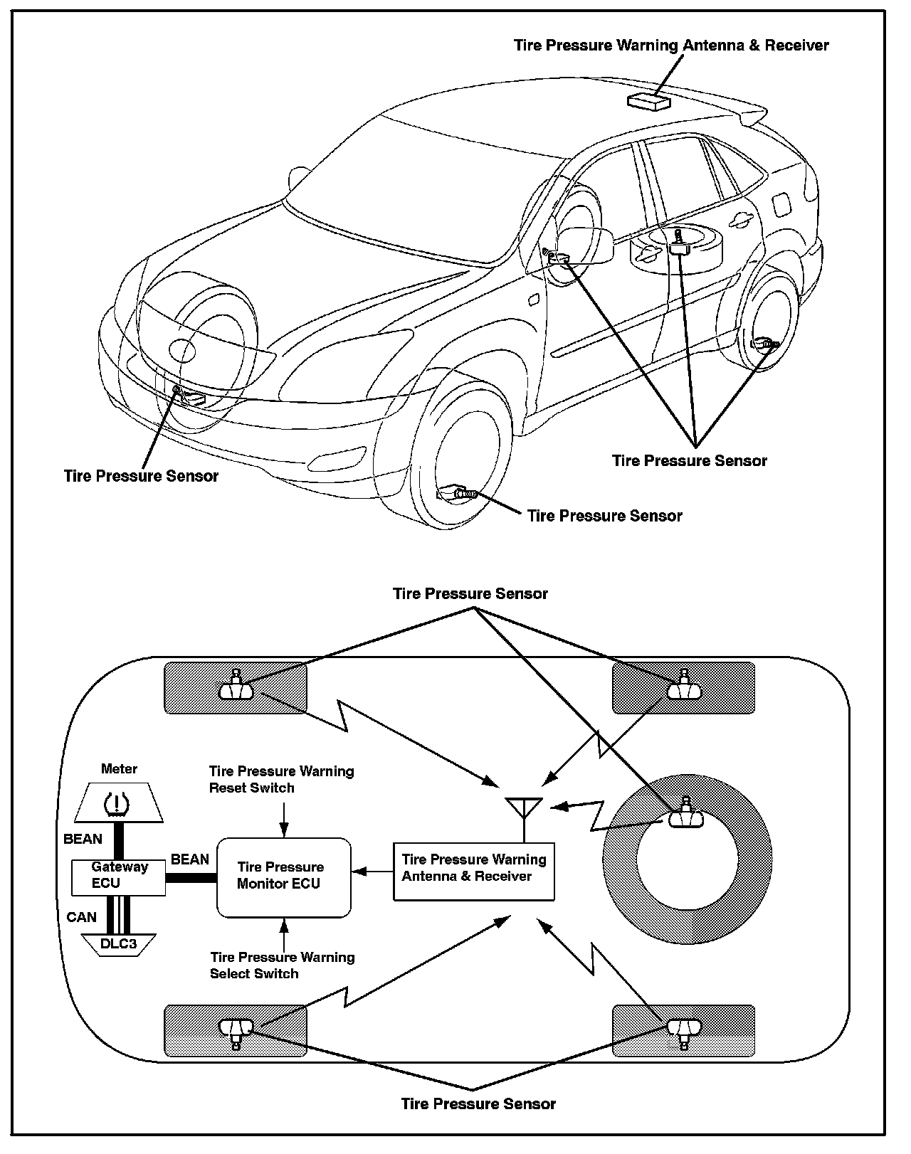 Each wheel (including the spare tire on certain vehicles) has a tire pressure warning valve/sensor integrated into the air valve with a unique ID number that measures the tire pressure and tire temperature and then transmits the information to the antenna/receiver mounted inside the vehicle through a radio wave signal. The unique ID number must be manually entered into the ECU using TIS Techstream whenever the tire pressure warning valve/sensor is replaced or after a tire and wheel are exchanged.