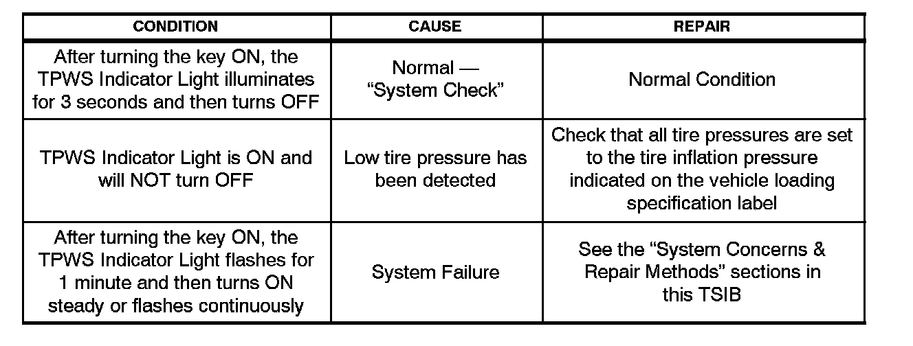 Conditions for the Tire Pressure Warning System Indicator Light "ON" or "Flashing" are listed in the table shown.