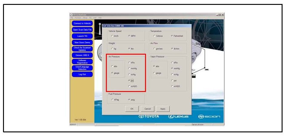 When diagnosing the TPWS with TIS Techstream, it must be set up to read the tire pressures in psi - gauge" (psi - g). Follow the screens below from TIS Techstream to convert the tire pressures to psi - g.