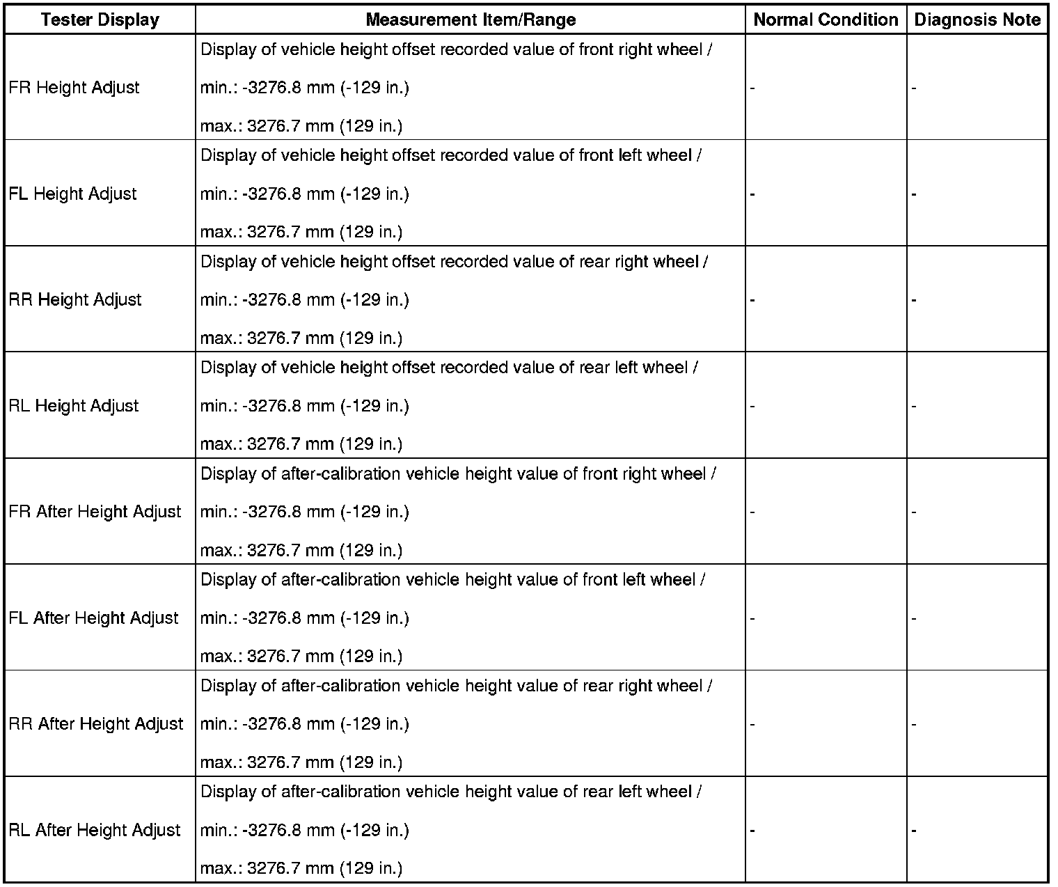 The possible vehicle height automatic adjustment value is 20 mm (0.787 in.). If the "Height Adjust value + (Standard value - Measurement value - After Height Adjust value)" is 20 mm (0.787 in.) or more, first perform the vehicle height adjustment for the front side, and for the rear side.