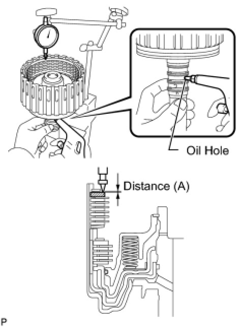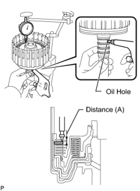 (c) Using a dial indicator, measure the moving distance (A) of the clutch flange at both ends across the diameter while blowing compressed air (196 kPa, 2.0 kgf/cm2, 28 psi) into the oil hole as shown in the illustration. Then choose from the 11 flange thicknesses in the table so that the measured value is within the standard value.