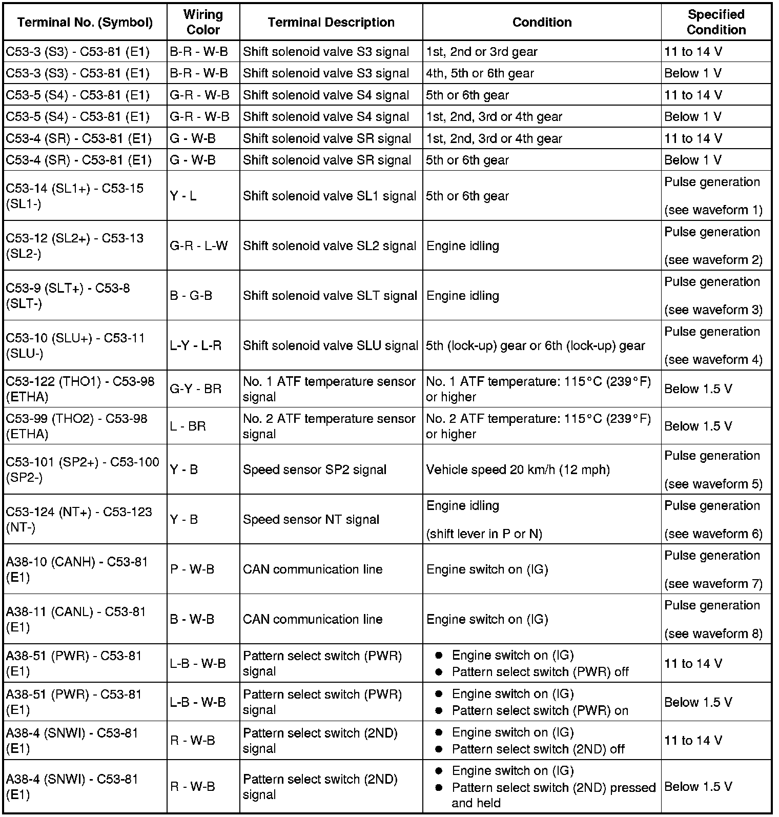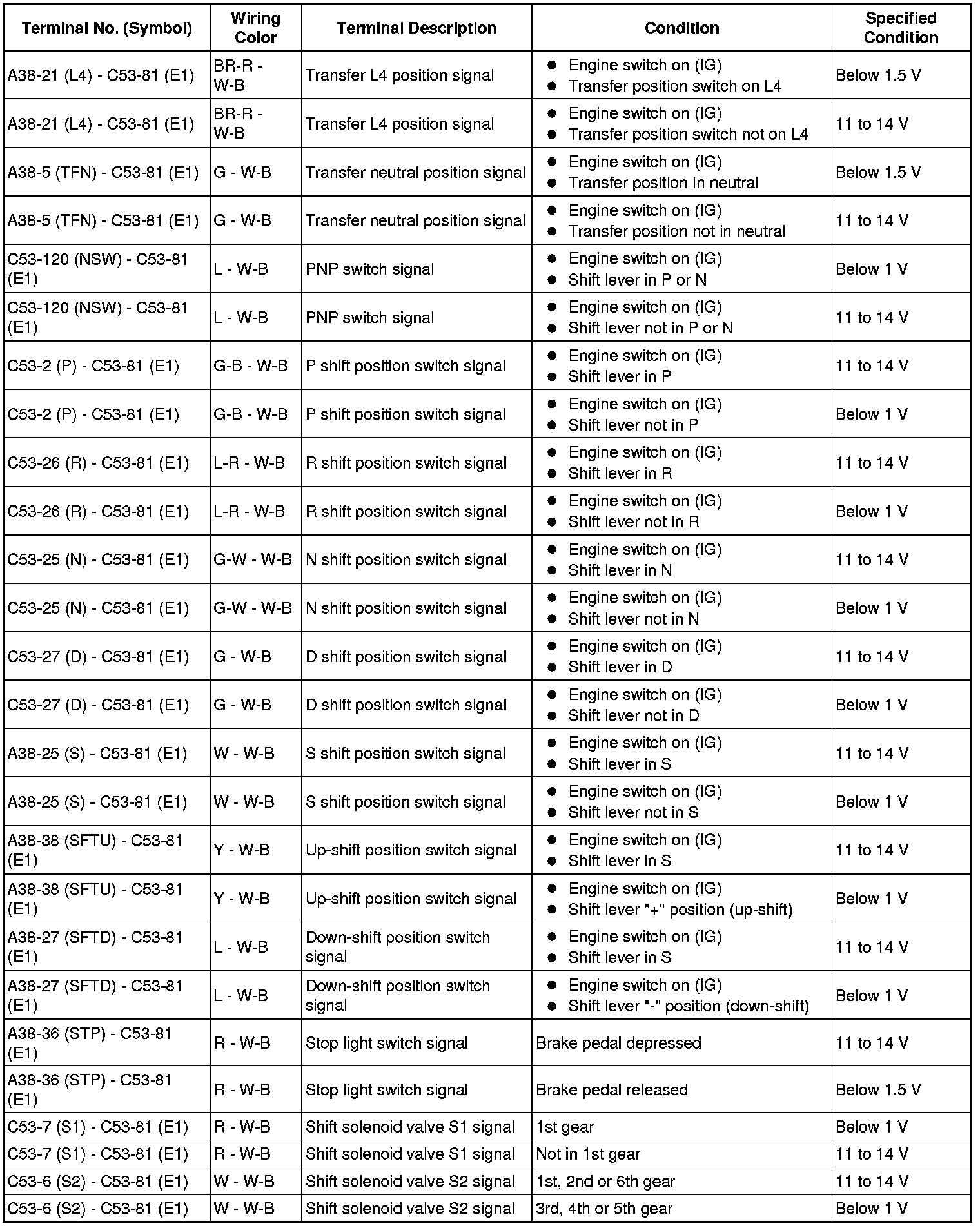 In the table, first follow the information under "Condition". Look under "Terminal No. (Symbol)" for the terminals to be inspected. The standard voltage between the terminals is shown under "Specified Condition".