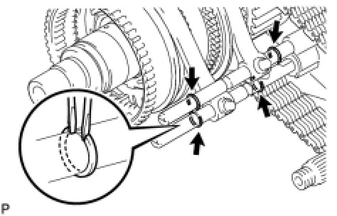 (a) Using 2 screwdrivers and a hammer, tap off the 4 shift fork shaft snap rings.