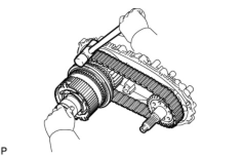 (b) Using a plastic-faced hammer, carefully tap the rear transfer case, and remove the output shaft together with the drive chain and driven sprocket.