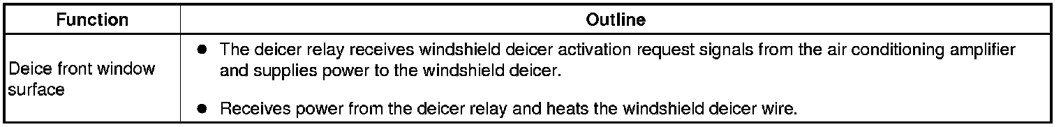 The thin heater wires of the windshield deicer system are attached to the inside of the windshield glass and deice the windshield surface quickly. The indicator light illuminates while the system is operating. The system automatically turns off after approximately 15 minutes.