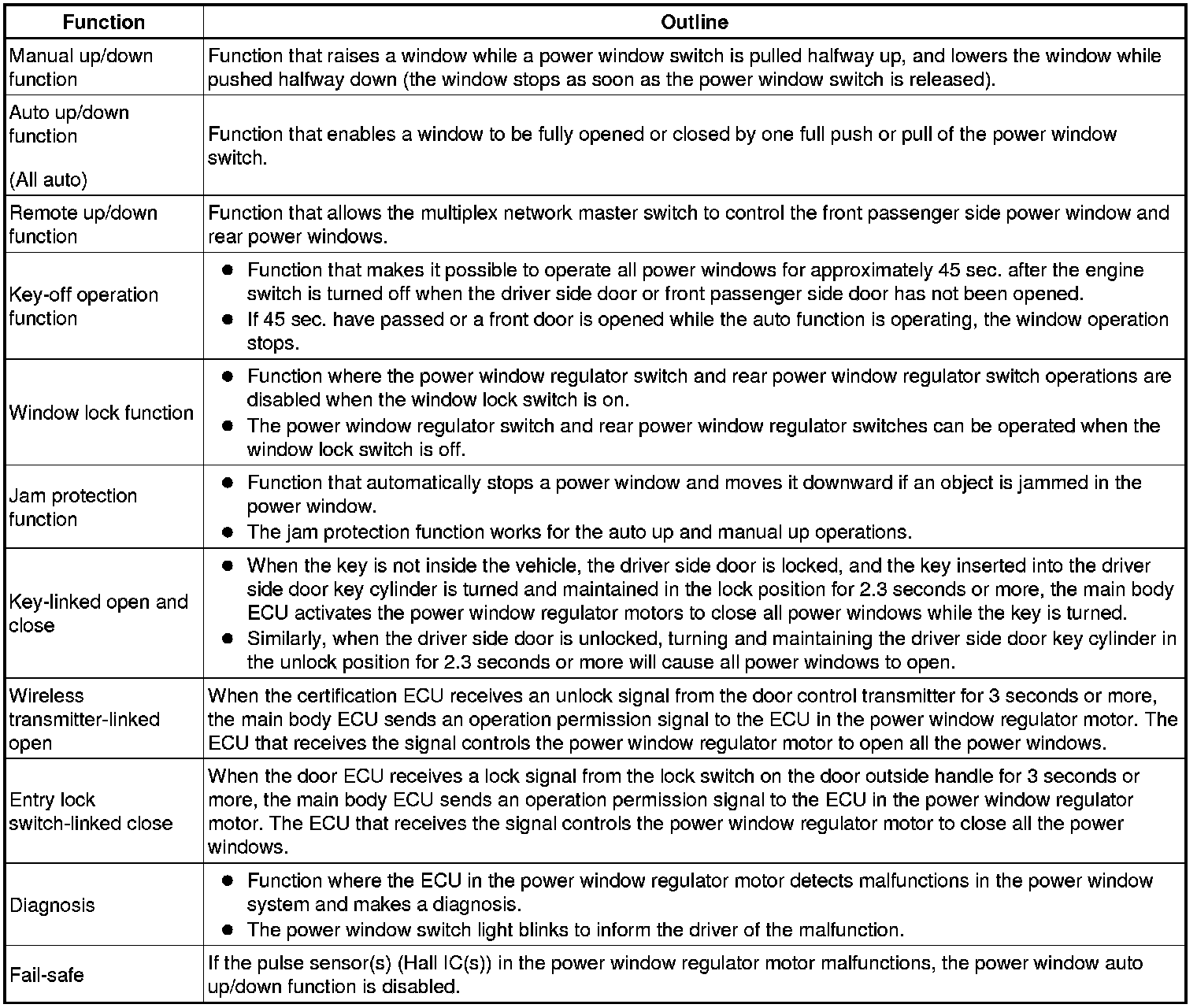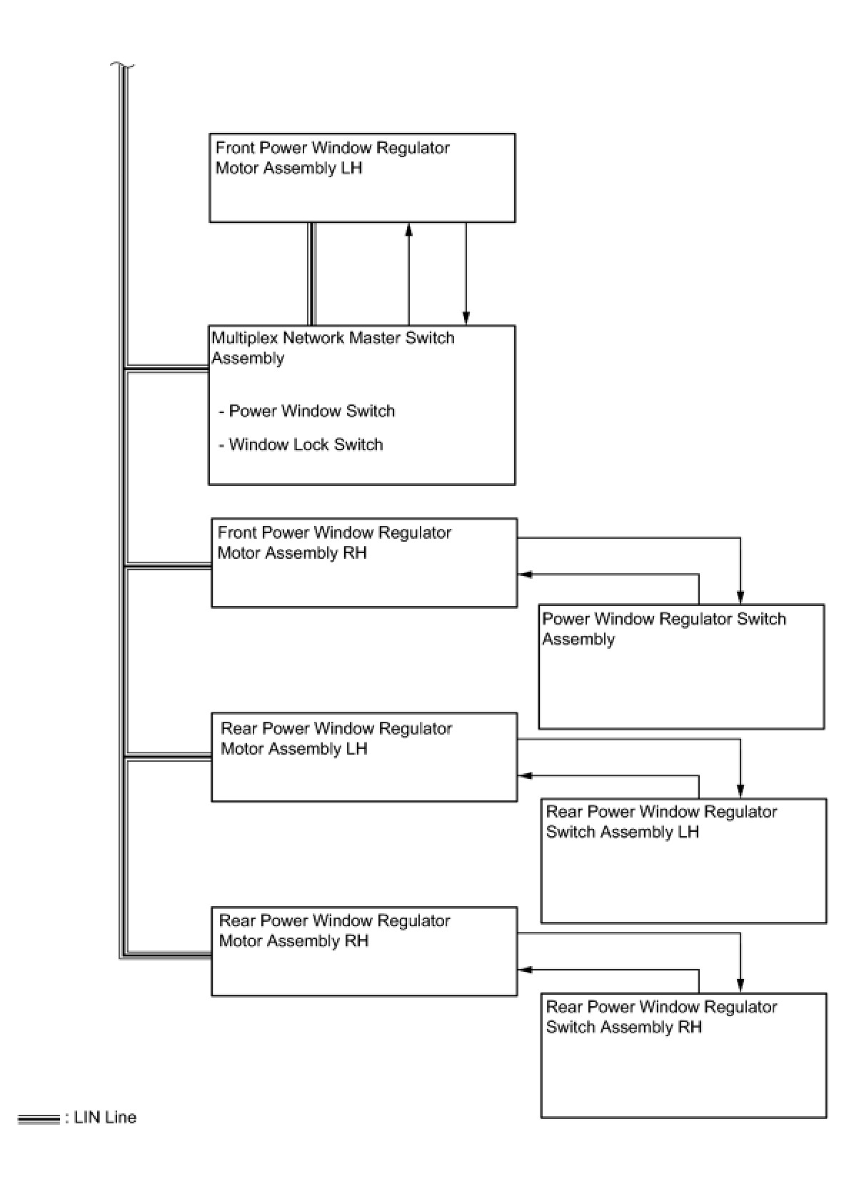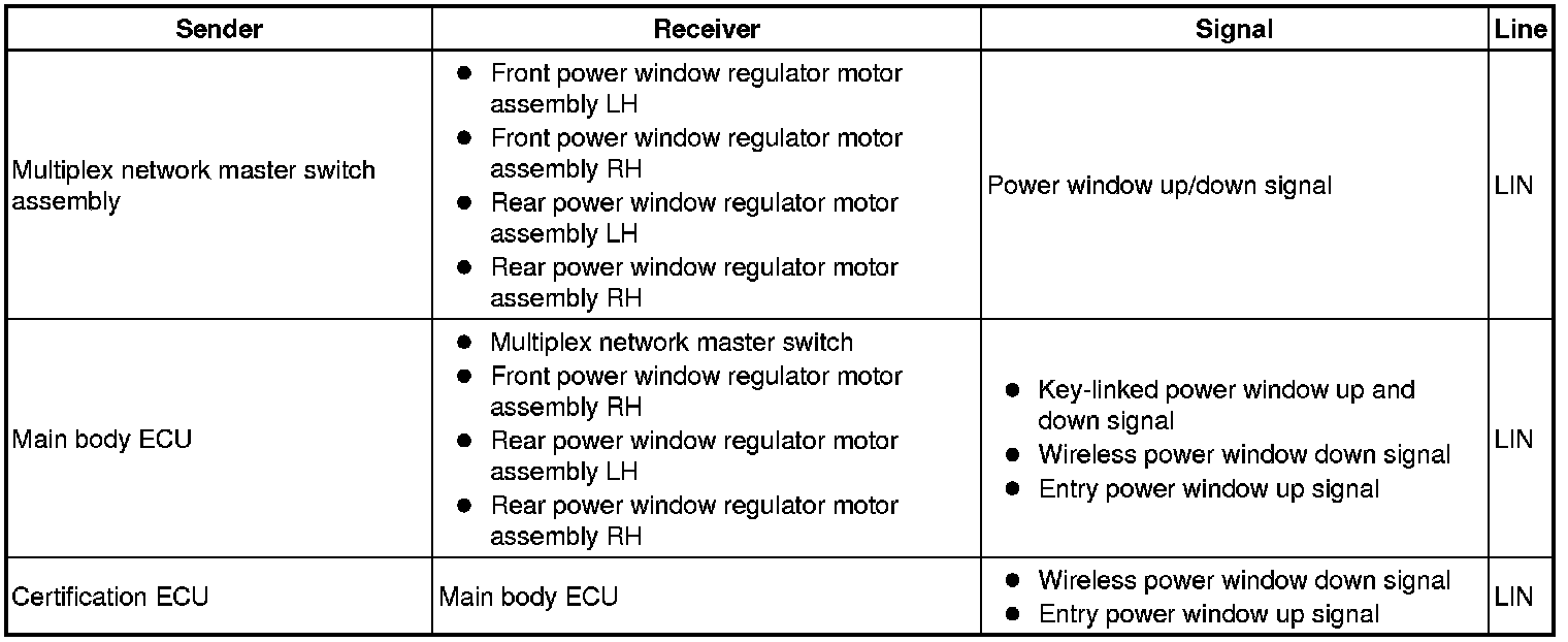 - Pressing either of the power window switches on the power window regulator switches or either of the power window switches on the multiplex network master switch transmits an up/down signal to the corresponding power window regulator motor.