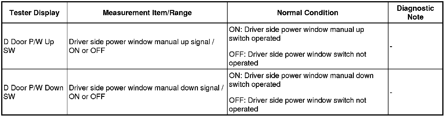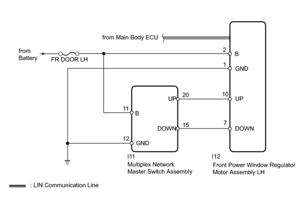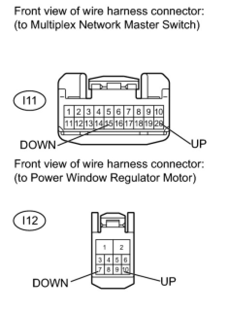 - If the manual up/down function does not operate, there may be a malfunction in the multiplex network master switch, power window regulator motor, harness or connector.