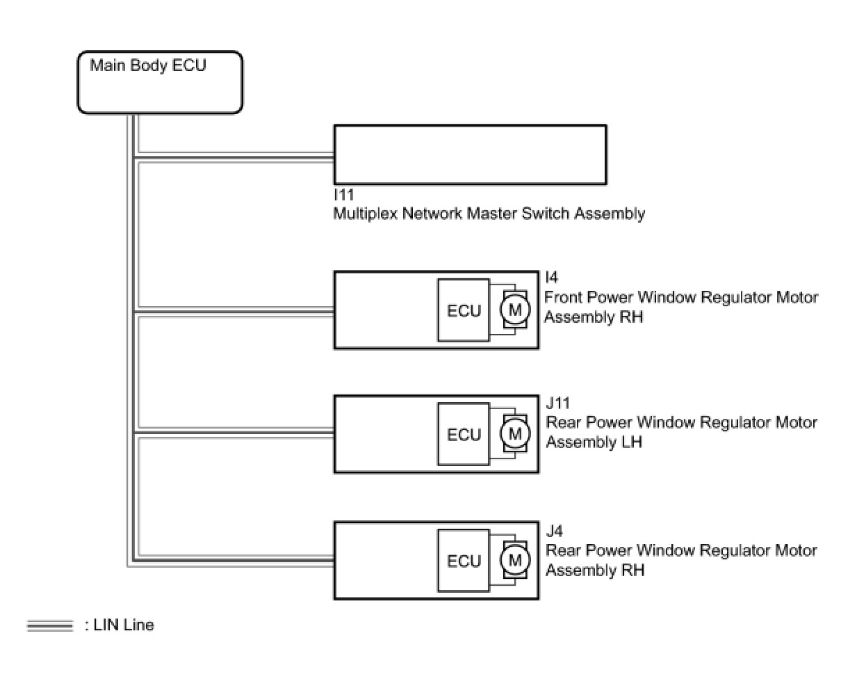 When the engine switch is on (IG) and window lock switch is off, the multiplex network master switch sends remote up/down signals to each power window regulator motor via the LIN communication line.