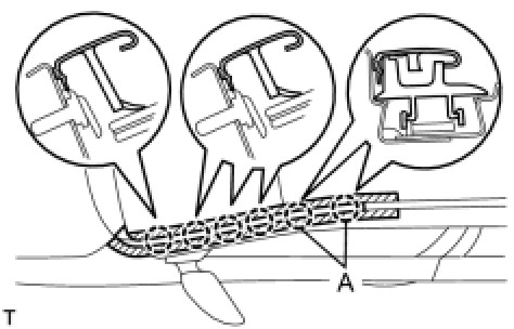 - When removing the windshield outside moulding, be careful not to damage the roof drip side finish moulding clip labeled A in the illustration.