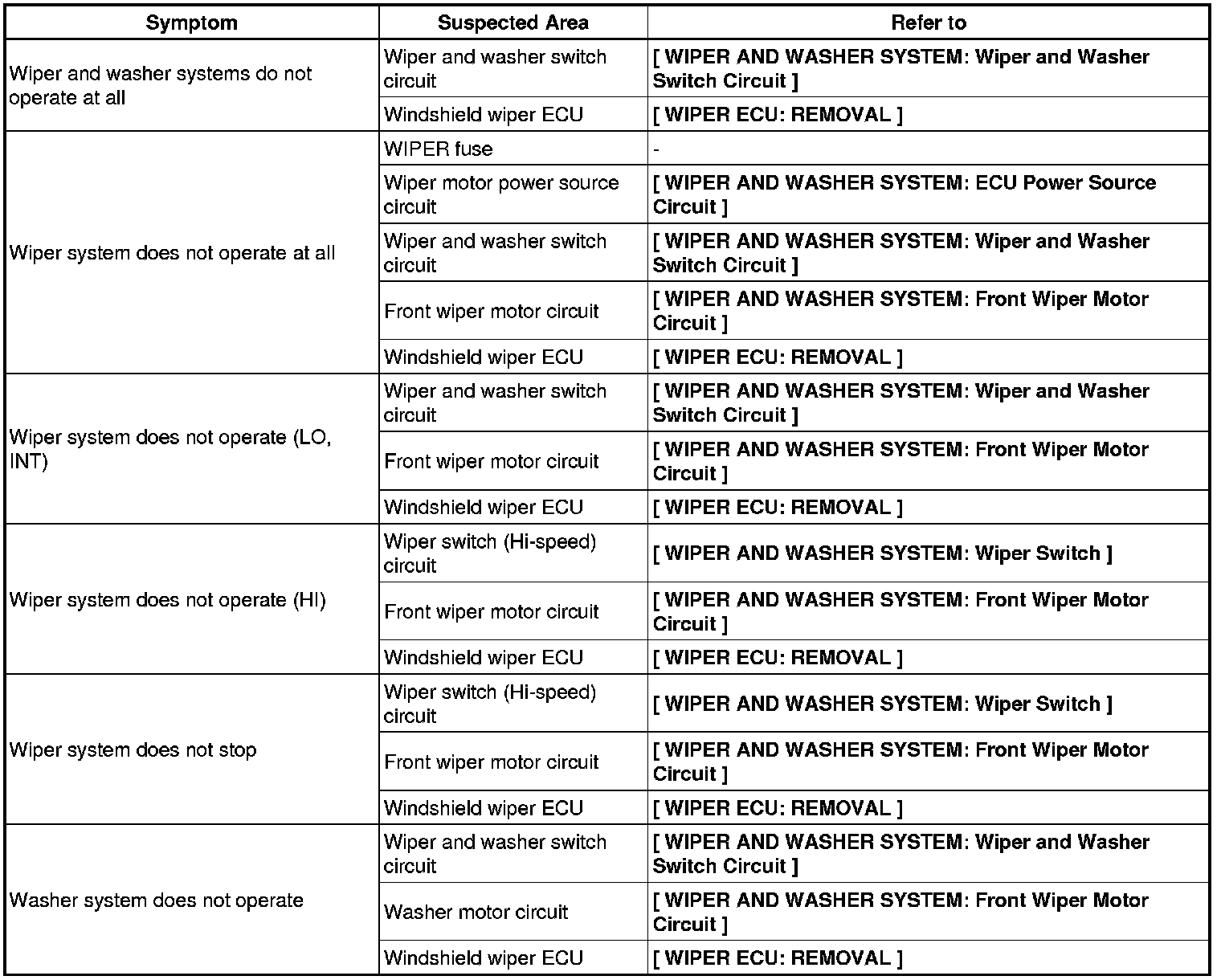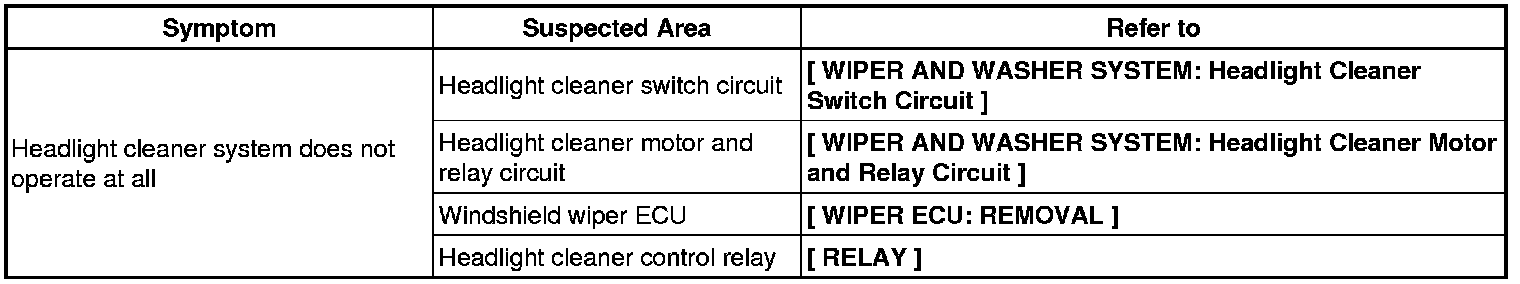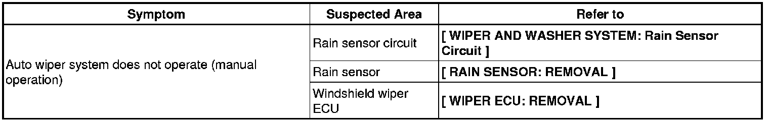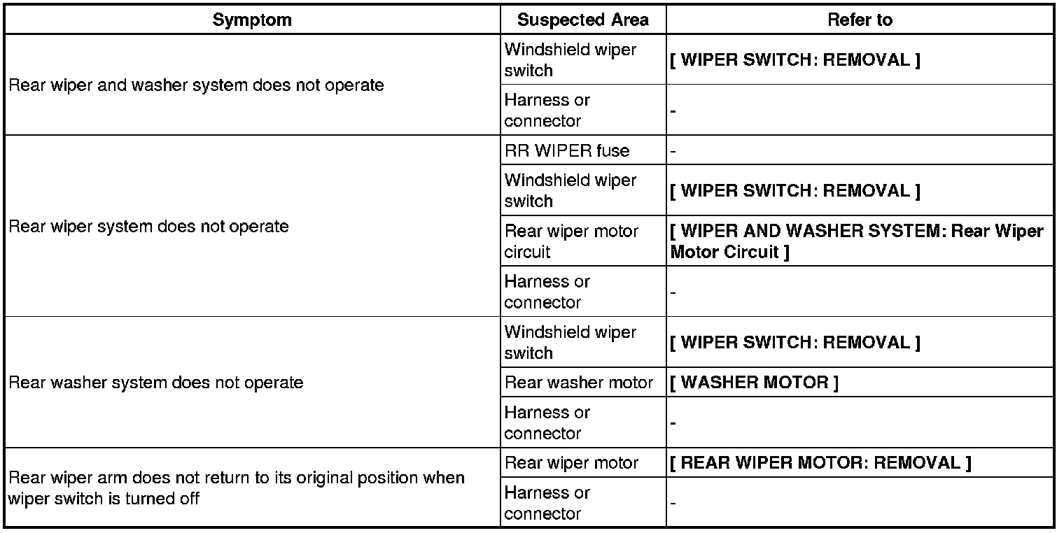 WIPER / WASHER: WIPER AND WASHER SYSTEM: PROBLEM SYMPTOMS TABLE